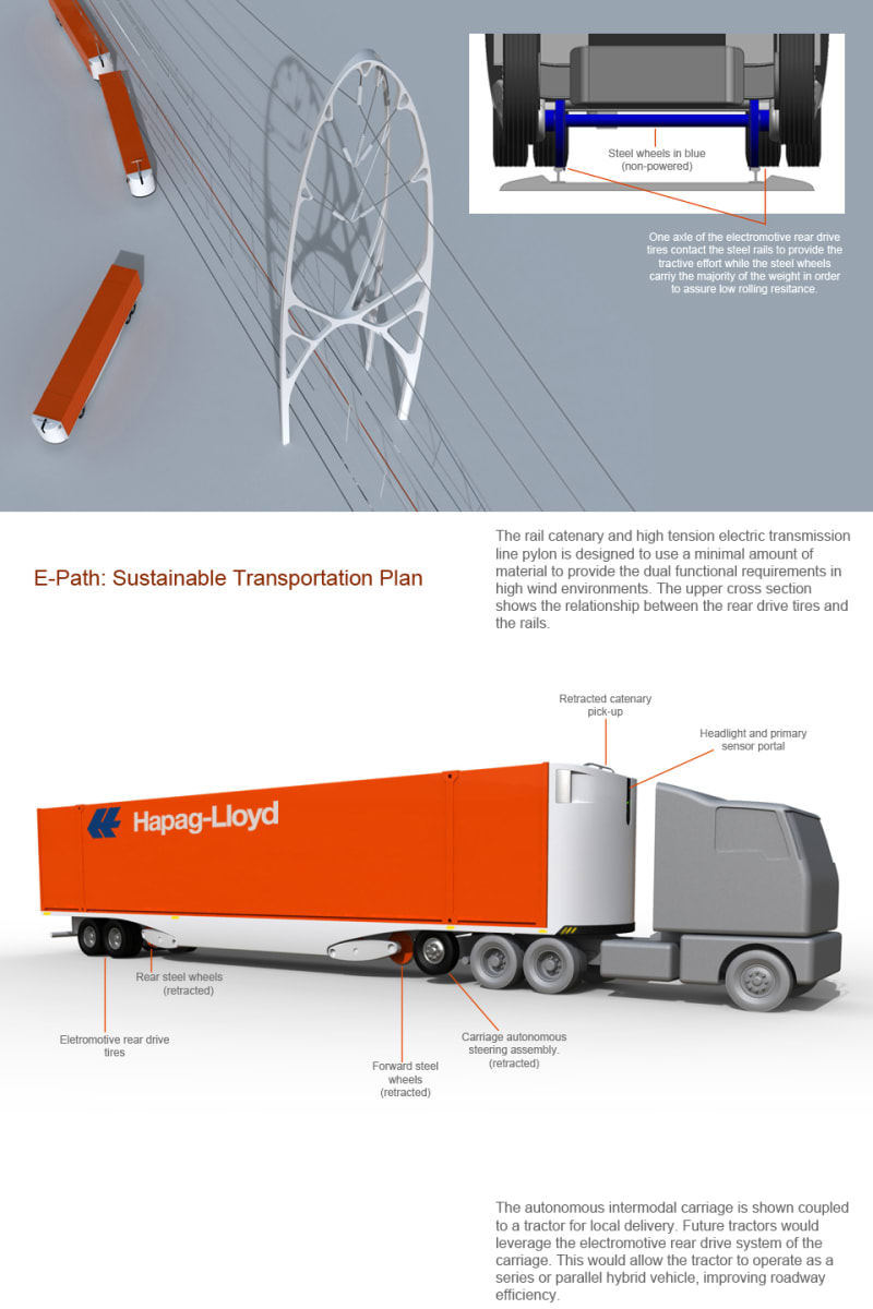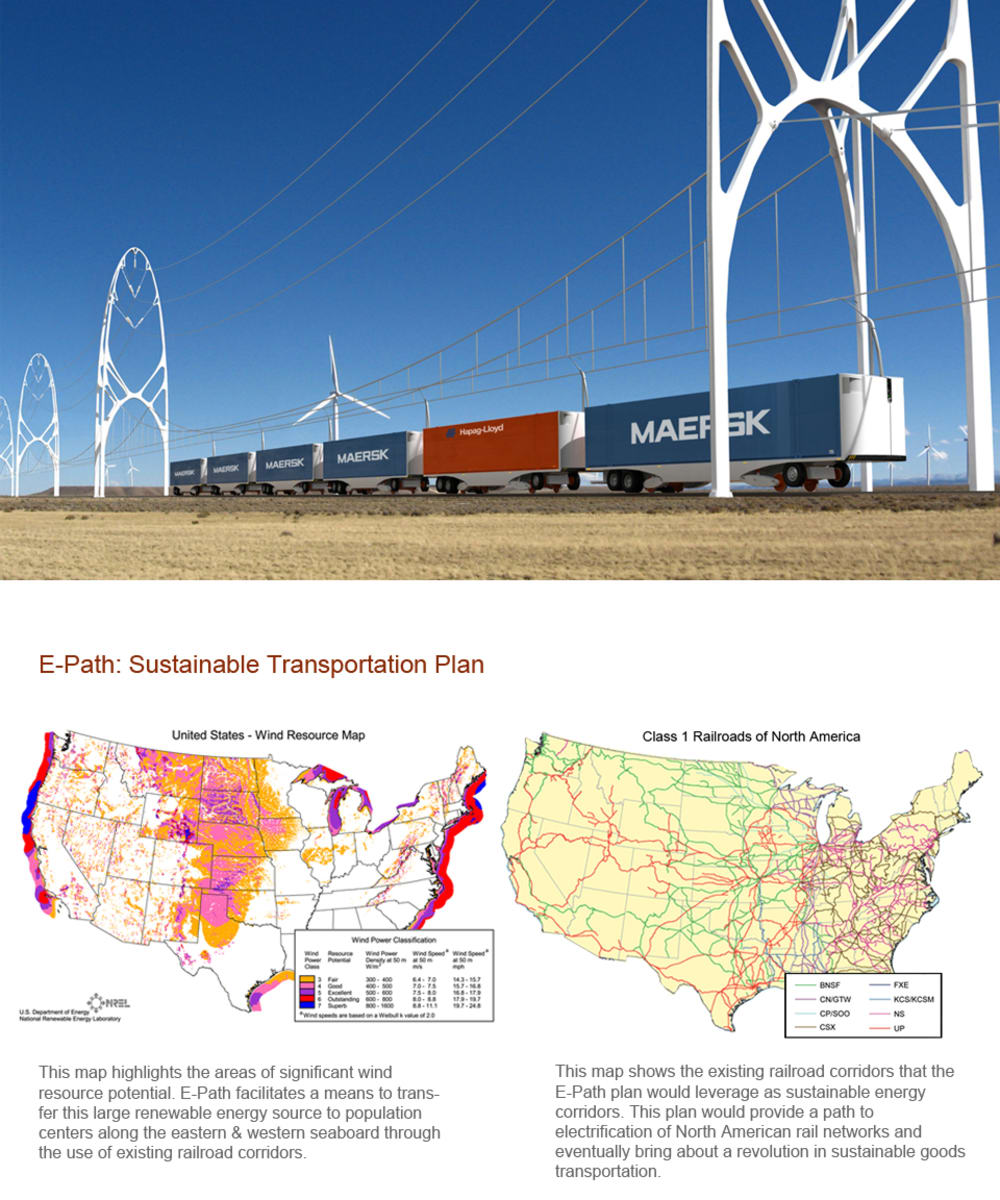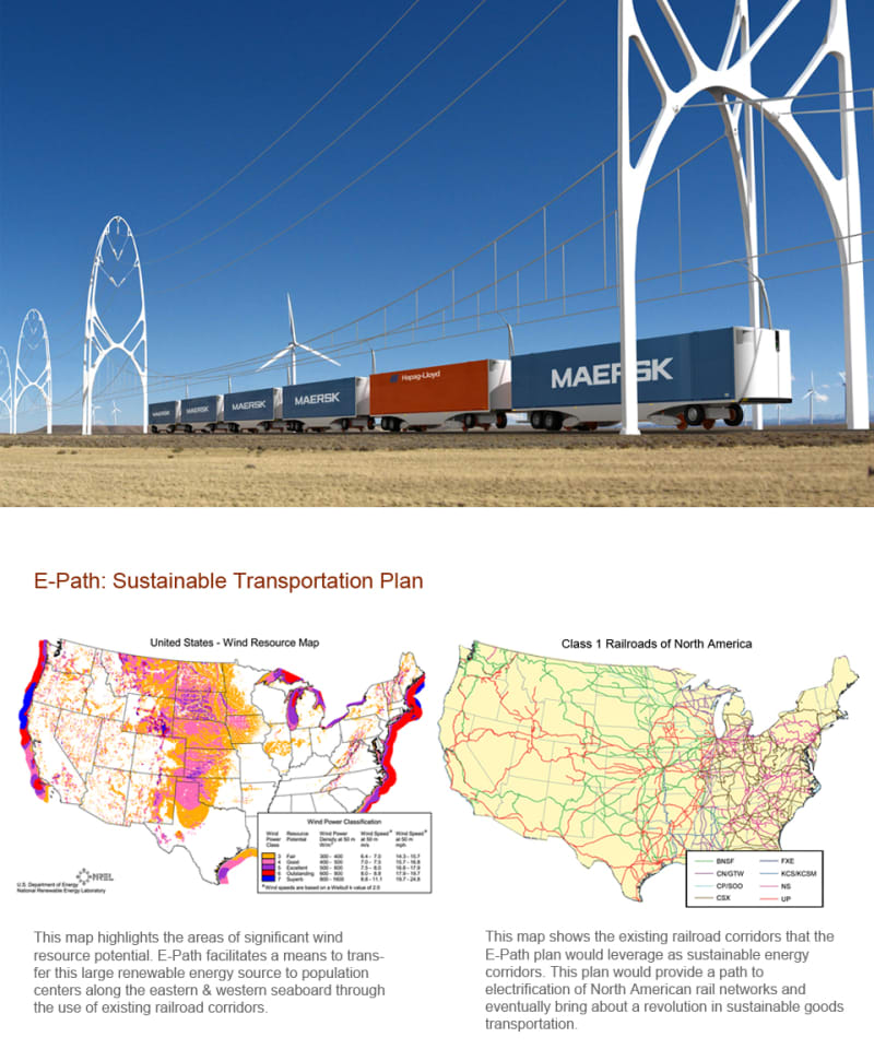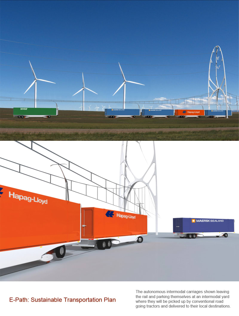 E-Path is a concept to facilitate electrification of the North American rail network while providing the right of way for the electrical transmission infrastructure needed to access the large amount of wind energy in the center of the continent. It then leverages the electrified rail network to provide an evolutionary path to fully autonomous intermodal rail service as well as a path to electrification/hybridization of commercial trucking. The intermodal carriages carry their own electric drive train that powers the rear set of tires. 4 deployable steel wheels carry the weight when on the rails. Initially the carriages would be pulled on the street with conventional tractors. However, next generation tractors would be developed that would leverage the electromotive drive train in the rear of the trailer, and in doing so provide a more efficient form of motive power.