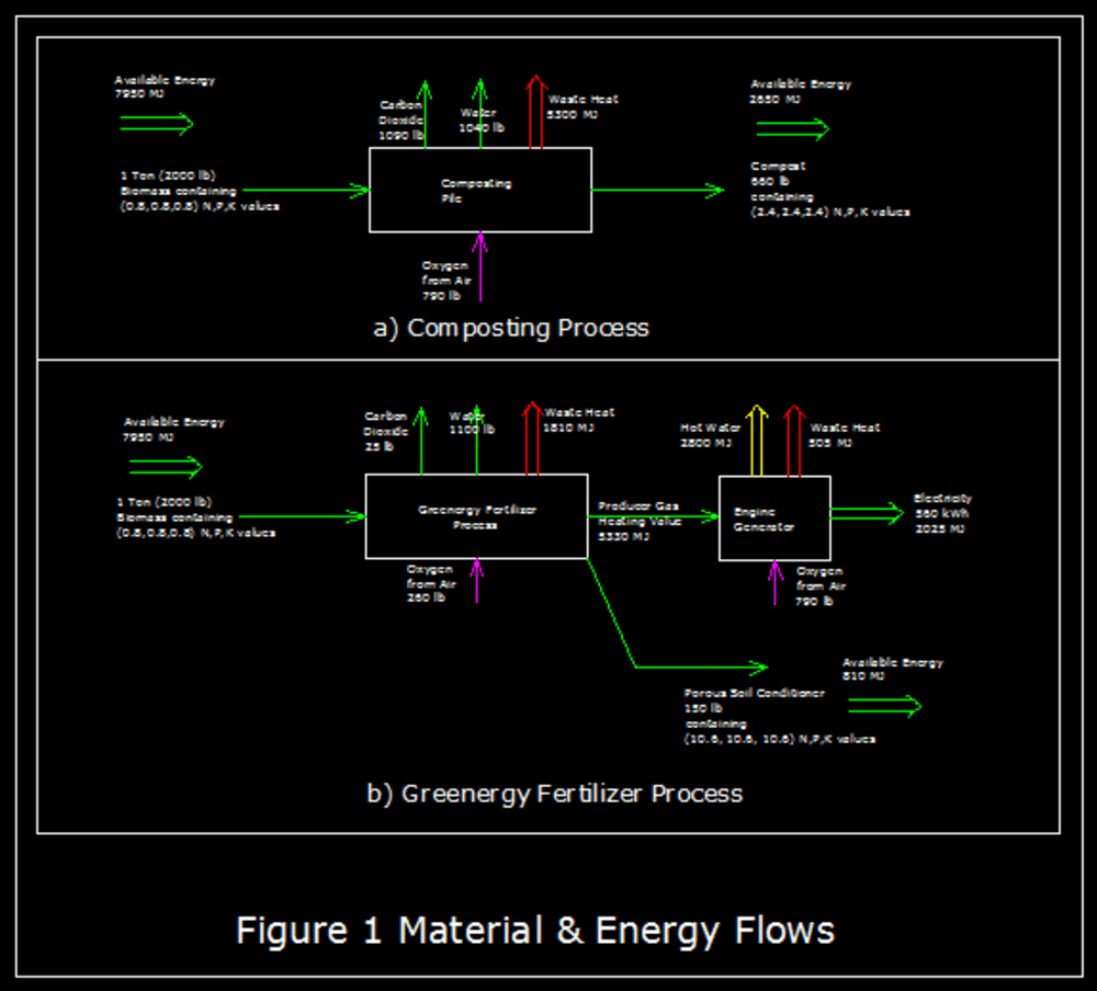 In composting, bacteria growing on biomass oxidize carbon to carbon dioxide (and evaporate moisture) thereby reducing its weight. This oxidation of biomass converts a large amount of energy to heat. Quantitatively speaking, composting of 65 million tons of biomass produces 22 Million tons of compost, and releases 350 billion MJ of energy as heat. This is equal to 10 days of energy wasted as heat from all US power plants. Figure 1a schematically shows the material and energy flows during composting. Note all N, P, K values present in feed remain in the compost, but due to its reduced weight, the concentration is higher. For illustration it was assumed that the feed contained 16 lb/ton of each N, P, and K.