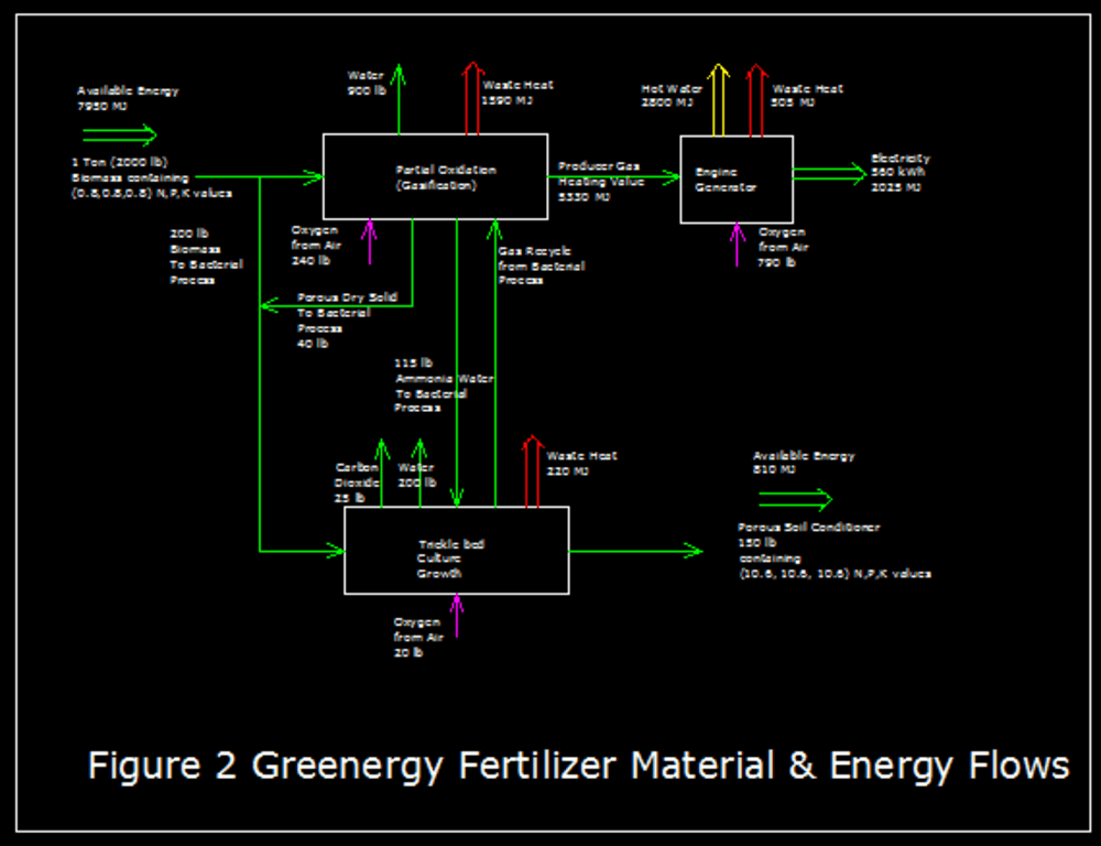 My design can claim carbon credits on the basis of producing usable energy from previously wasted energy. Material and energy flows for Greenergy Fertilizer process are shown in Figure 1b. Assuming the same feed as that for composting, the fertilizer product has higher N P K values. The essence of the design is to use a controlled partial oxidation (gasification) process in combination with a bacterial process (Figure 2).