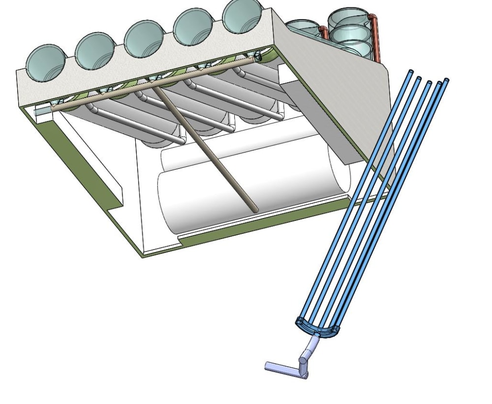 The bioreactor air scrubber will contain fiber optic fibers that hang inside the tube. Light passes through the fibers helping to diffuse the light. A reflector on the bottom catches the unused light and sends it back. As the fibers serve as a surface for the algae to grow around it creates a large surface area. This area allows for a greater air exchange. The bioreactor also contains a unique air flow system and diffuses the air through the tube. Two pumps control the air flow. One at the beginning pushing the air and one at the end pulling the air.