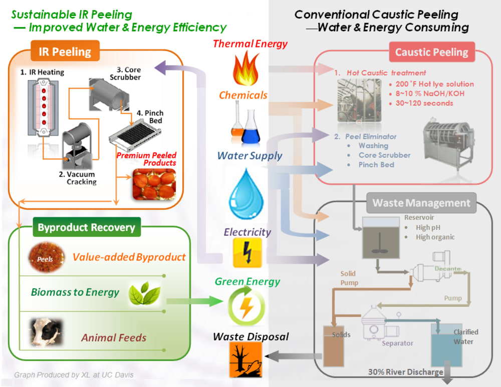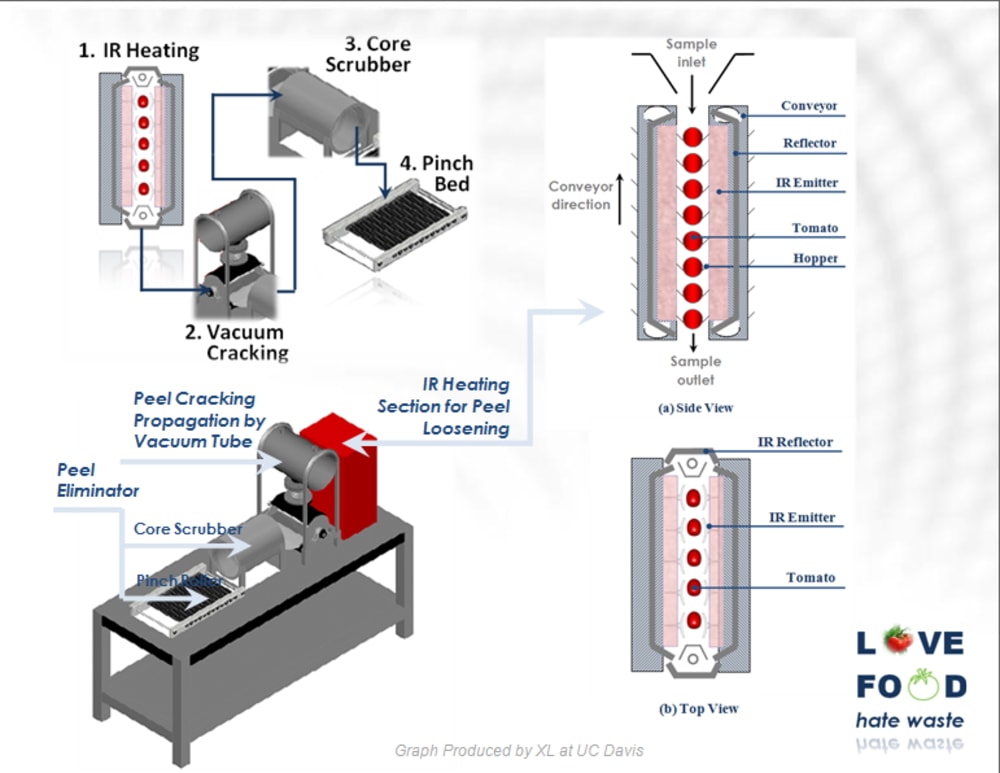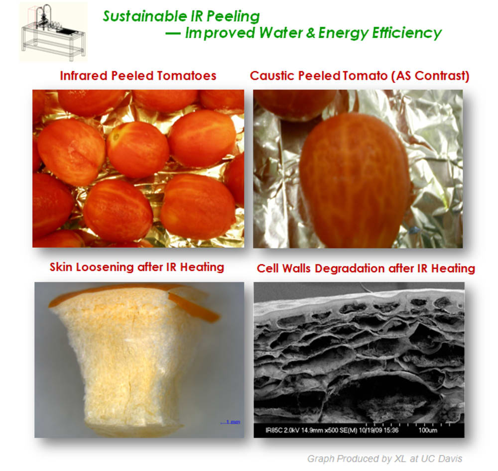 The current tomato peeling process is a water- and energy- intensive operation and results in a large amount of wastewater. Particularly, the wastewater from caustic peeling method using hot lye solution is high in salinity and organic load due to loss of tomato solid during peeling. It is reported that the water consumption for tomato processing in California alone is about 10.7 billion gallons per year, while expenses of wastewater management could be up to $8,000 per ton of total dissolved solids. Presently, tomato processors are under intense regulation and environmental pressure and are seeking alternatives to replace caustic peeling. The development of sustainable tomato peeling technology has recently been identified as an urgent and a top priority by the Energy Efficiency Roadmap for the California Food Industry. To address the critical challenges in the food industry, we designed and are developing a novel and sustainable peeling method which uses infrared (IR) heat without water.