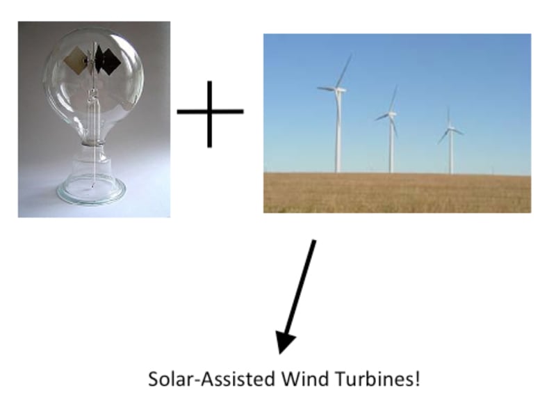 The Crookes radiometer consists of a partially-evacuated, airtight glass bulb containing a set of vanes mounted on a spindle where each vane is silvered on one side and blackened on the other. Rotation of the vanes and spindle occurs when the vanes are exposed to light or heat. The reason for the rotation has been attributed to thermal transpiration. Osborne Reynolds found that if a porous plate is kept hotter on one side than the other, the interactions between gas molecules and the plates are such that gas will flow through from the cooler to the hotter side (thermal transpiration). The vanes of a typical Crookes radiometer are not porous, but the space past their edges behaves like the pores in Reynolds plate. On average, the gas molecules move from the cold side toward the hot side whenever the pressure ratio is less than the square root of the (absolute) temperature ratio. The pressure difference causes the vane to move cold (white) side forward. Note that if light pressure impinging on the silvered side of the vanes was instead causing the vanes to move, then they would spin in the opposite direction and this does not happen unless the air is evacuated until a very high partial vacuum exists inside the glass bulb. \r\n Surprisingly, it can be demonstrated that a simple yard windmill that has its vanes blackened on the windward side (side struck by the wind) and silvered on the leeward side will spin faster than normal when exposed to both sunlight and a slight breeze! It can even be shown that the windmill will continue to spin when sunlight strikes the vanes, but when no wind is blowing at all! Thermal transpiration is evidently at work causing the yard windmill to spin from the heat of the sun as eddy currents of air flow from one side of the vanes to the other even though the vanes are offset forty-five degrees or so from the vertical position. This “solar assist” effect may admittedly only be noticed in the yard or ranch-type windmills because of their many thin, knife-edged vanes for the air currents to move around (a large combined edge-length), but suppose the same solar-assist effect can be made to occur on the very large three-bladed wind turbines that are in wide use today. If that were the case, then solar energy can be used to supplement the work derived from the wind to spin the turbines and generate electricity! Moreover, the fact that energy from the sun works to spin the turbine implies the solar energy is converted to alternating current by the same turbine generator. Compare that to the lack of efficiency in converting low voltage direct current electricity generated by photovoltaic cells instead. \r\n Just think, solar energy may be able to add five, ten, or even twenty-five percent more work output to the solar-assisted wind turbines by doing nothing more than blackening one side of each blade and silvering (whitening) the opposite side!