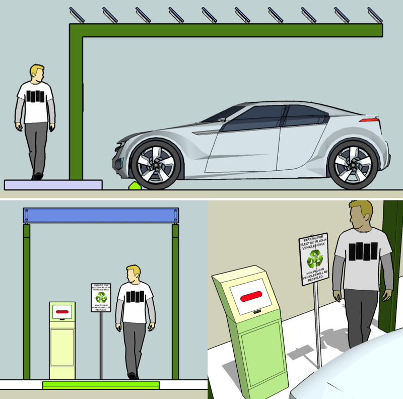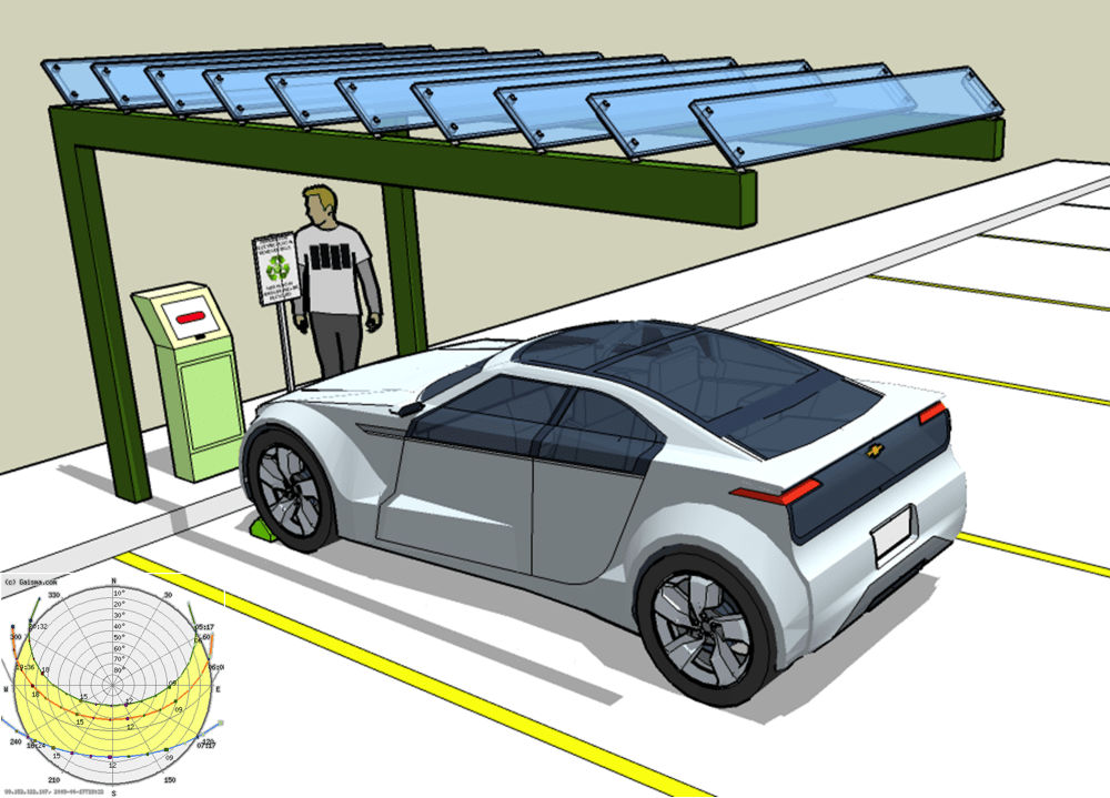 This entry seeks to draw attention to the looming crisis plug-in automobiles will have on our outdated, inadequate electrical grid infrastructure. For any benefit to be gained from plug-in automobiles, adoption rates will have to be substantial enough to cause severe stress to our already overtaxed electrical grid. The “smart grid” is an oxymoron that is decades away from any resolution. A solution that does not locally produce its own power and streams it power thousands of miles is far from “smart”. Tying several stones together still will not float anymore than one stone will. As local cities and municipalities experience insufficient funds, the smart option to close the budget gap is local, sustainably produced power. Taking our relatively low power costs for granted is a dangerous proposition. “Clean coal’ is another oxymoron that has outlived it disingenuous inception. There is quite simply nothing remotely “clean” about coal. Coal ash avalanches, mass miner deaths due to unsafe conditions, dangerously rising lead levels in our water ways, mountain top removal mining, clear cutting forests, increasing respiratory problems all will forever be in our headlines. This solution seeks to minimize the impact by providing solar recharging stations at convenient locations across the country. The design has a standard kit of parts that can be rapidly installed and incentivized with discounted parking and located in close proximity to popular destinations. The control unit is cellular based and uses open source software to connect with customers easily integrating social networks, near field payment, online payment, data logging as well as low power consumption.