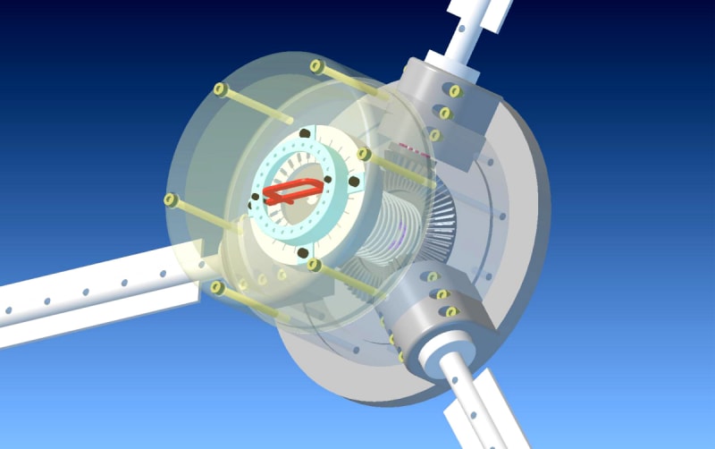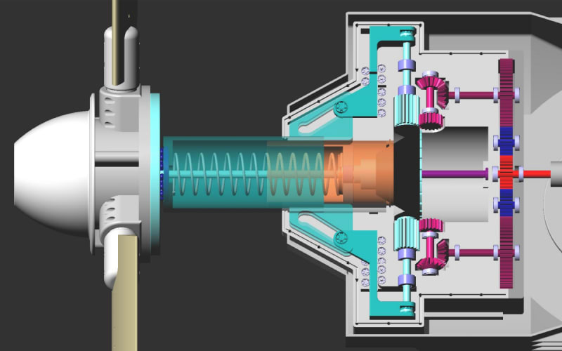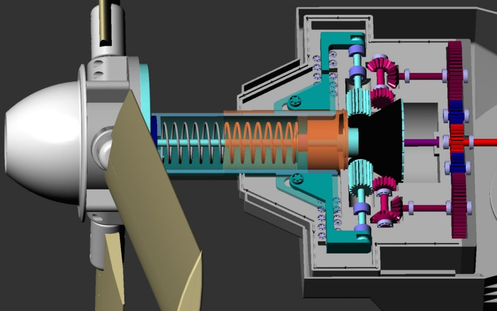 The gear is based on a conical shaped, in horizontal axis advancing/retracting main gear with satellite gears driving the output-shaft. The gear ratio is practically infinite, and in conjunction with the feathering hub able to provide a constant speed on the output-shaft to the generator.