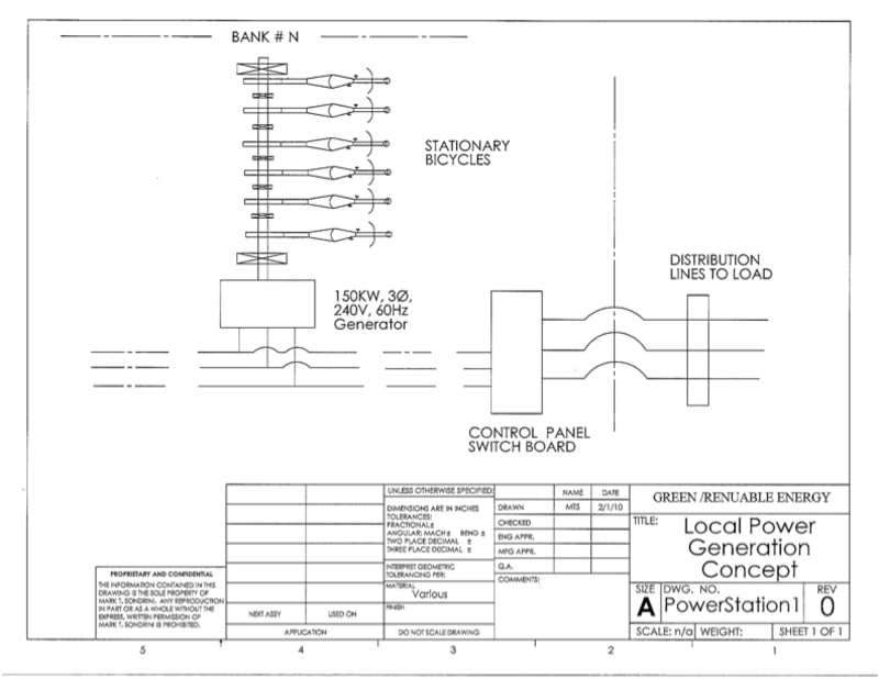 This concept is for local electrical power generation, easily scaleable to nearly any size or demand. The illustration shows one "bank" which would be suitable for a small village or neighborhood. Adding additional "banks" would make this suitable for whatever size demand. This could be constructed and used anywhere power is required and people are available to ride the stationary bicycles.