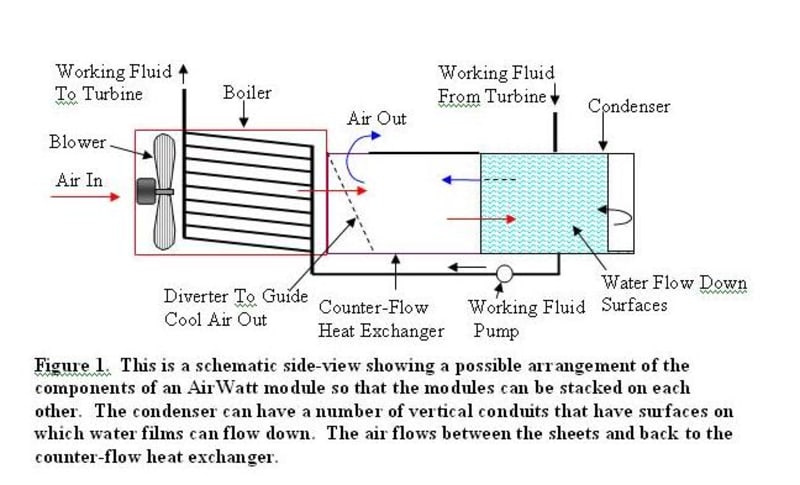If water is evaporated on a surface, the temperature achieved is normally the wet-bulb temperature. If the air is cooled before it reaches the surface, a lower temperature is achieved. One AirWatt innovation is that a stream of air flowing through the boiler is cooled. A second innovation is that this air is cooled further in a heat exchanger, and then it flows to surfaces in the condenser where water films are flowing down. Since the air has been cooled considerably, it becomes quite cold as it evaporates water on the condenser surfaces. After the cold air leaves the condenser, it flows back through the heat exchanger to provide cooling for the incoming air. See the attached illustrations.