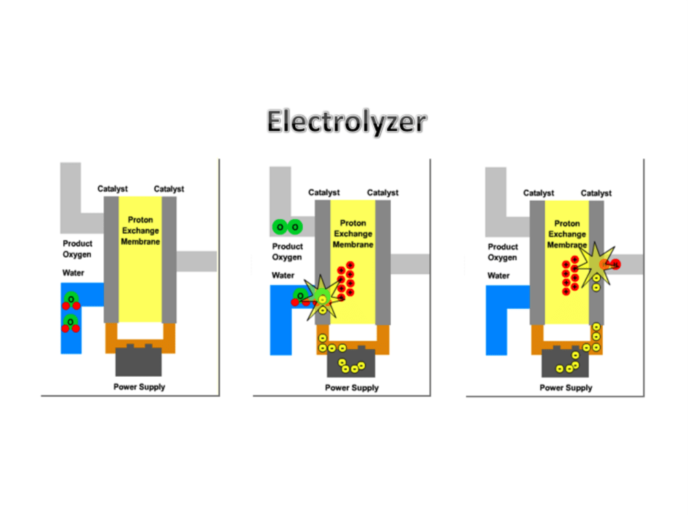 An Electrolyzer is used to separate the hydrogen and oxygen molecules of the distilled water. The Electrolyzer utilizes a Proton Exchange Membrane (PEM), which only allows positively charged ions though, to separate the negative and positively charged ions. The voltage difference generated from the potential energy of the oppositely charged ions stimulates hydrogen and oxygen production.