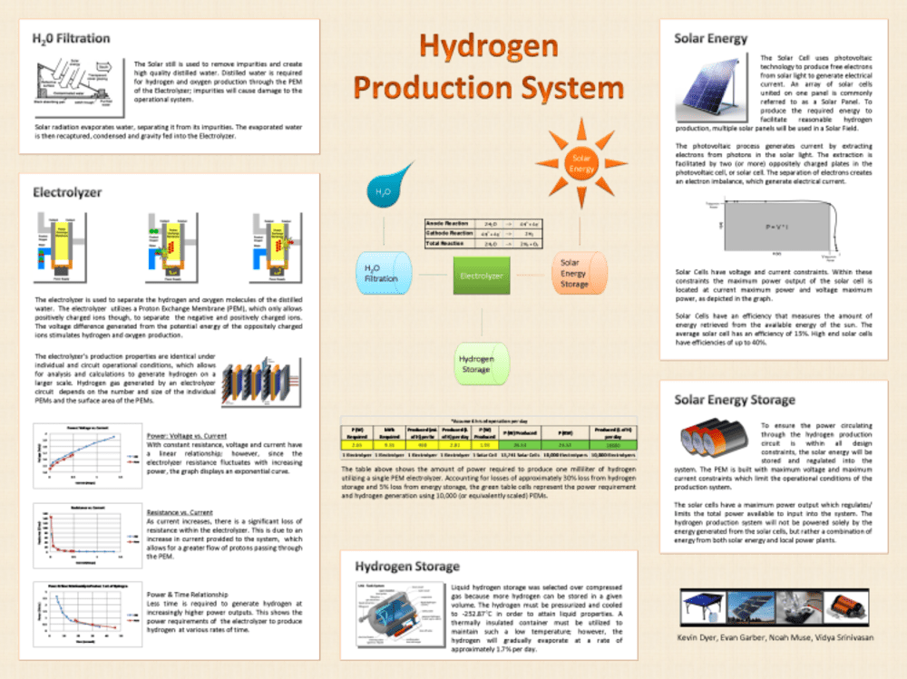 To ensure the power circulating through the hydrogen production circuit is within all design constraints, the solar energy will be stored and regulated into the system. The PEM is built with maximum voltage and maximum current constraints which limit the operational conditions of the production system.