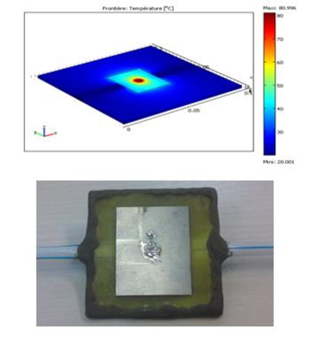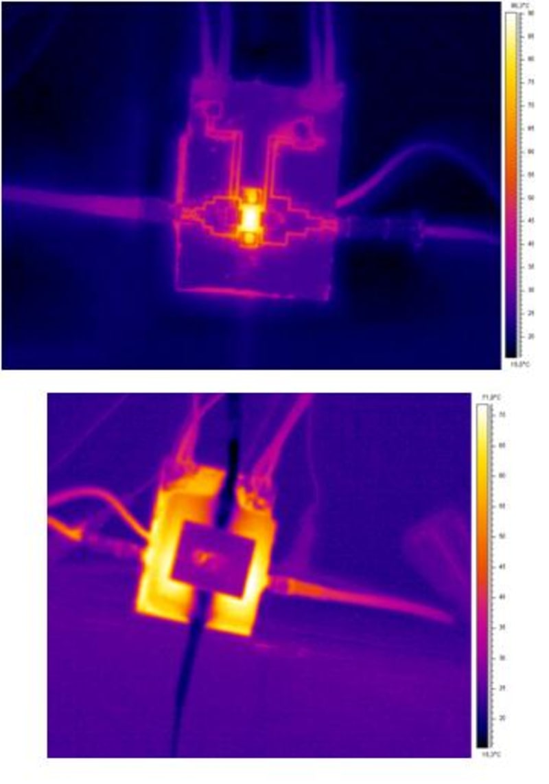 The maximum temperature at the transistor side is close to 80 °C and the maximum temperature at the antenna side is close to 70 °C. This means that the The thermal power removed through microstrip heatsink antenna cooled with water is about 10 Watt for maximum temperature of 80°C at the level of the power component.