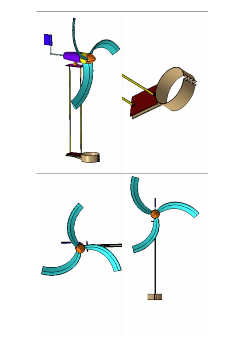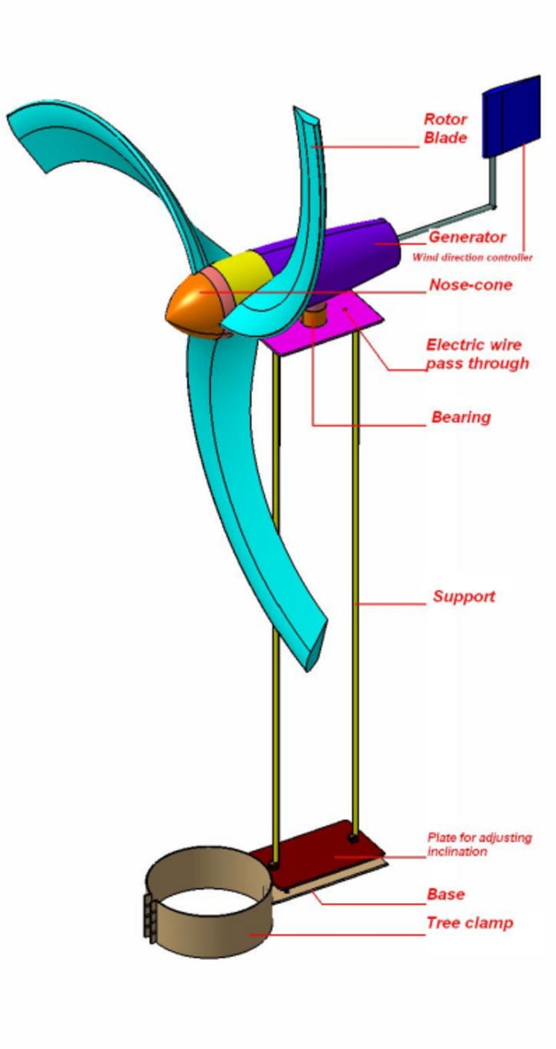 The fabrication and cost are inter-related, going for a high standard turbine made using plastic blades, steel-supports and a good quality Li-batteries it would cost ~Rs.14,000/($310), per wind turbine, but such a turbine would be unaffordable for rural Indian homes. Considering alternatives in the fabrication and assembly, by avoiding complexities of inclination, having a generator of lesser standard, substituting Li-batteries by common lead-acid and by changing the material of the rotor blades to that of thin plastic sheets and dry palm leaves, we can reduce the cost to even Rs.5,000/($110). This would be a more affordable cost to them and the break even occurs in 5-6 yrs, with frequent change of the rotor blades once in 6 months. (Estimates done assuming people pay Rs.4/- per unit electric consumption). The turbine is assembled with the clamp mounted on the tree and the supports being vertical to the ground.