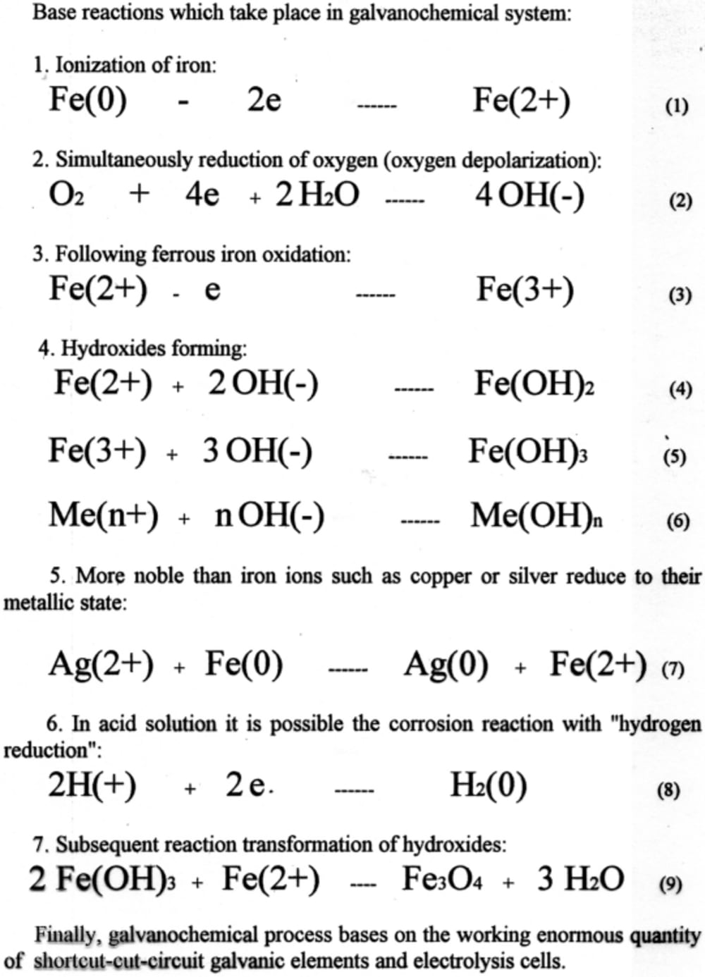 Equipment for this process contains a horizontal revolving cylinder with corroding material. That cylinder has inside mixing partitions (tumbling ribs), which are arranged in a so-called "waterfall" mixing pattern. For acceleration of oxygen reduction, which is linked to iron ionization, some neutral materials such as coke, titanium or stainless steel may be added to the galvanochemical system.