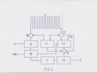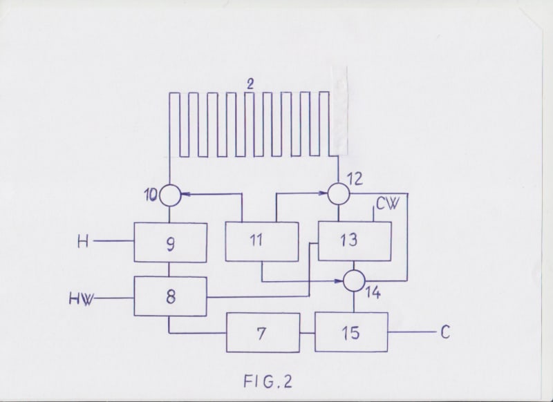 Expansion assembly 10 is switched off during hot weather and refrigerant passes through valve 12 and intake-water heater 13 to expansion assembly 14 . Heat exchanger 15 serves for the house cooling (C). The system is computer controlled by unit 11 . Simplified block diagram of the system is in figure 2. Temperature sensors are not shown in the figure.