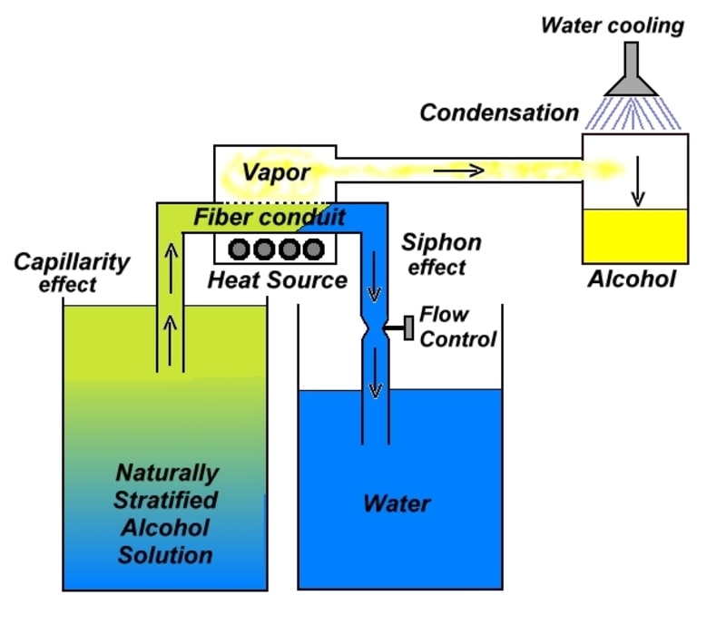 The process is simple: After fermenting agricultural goods, withouth filtering the solution, the alcohol present in the same can be distilled by inmersing a flexible pipe filled with fiber. The liquid will ascend by capillarity up to a capsule where a heating source (electric, flame, solar) will make alcohol to evaporate.The excess water will be "pulled out" by the controllable siphon effect in the other end of the pipe. Design controls are : fiber type, fiber compaction, height of capillarity end, depth of siphon end. Our tests indicate that 50 - 60% of the theorical is easily achievable, producing a 95% alcohol (depending on materials, mostly is ethanol, but some methanol is also present)