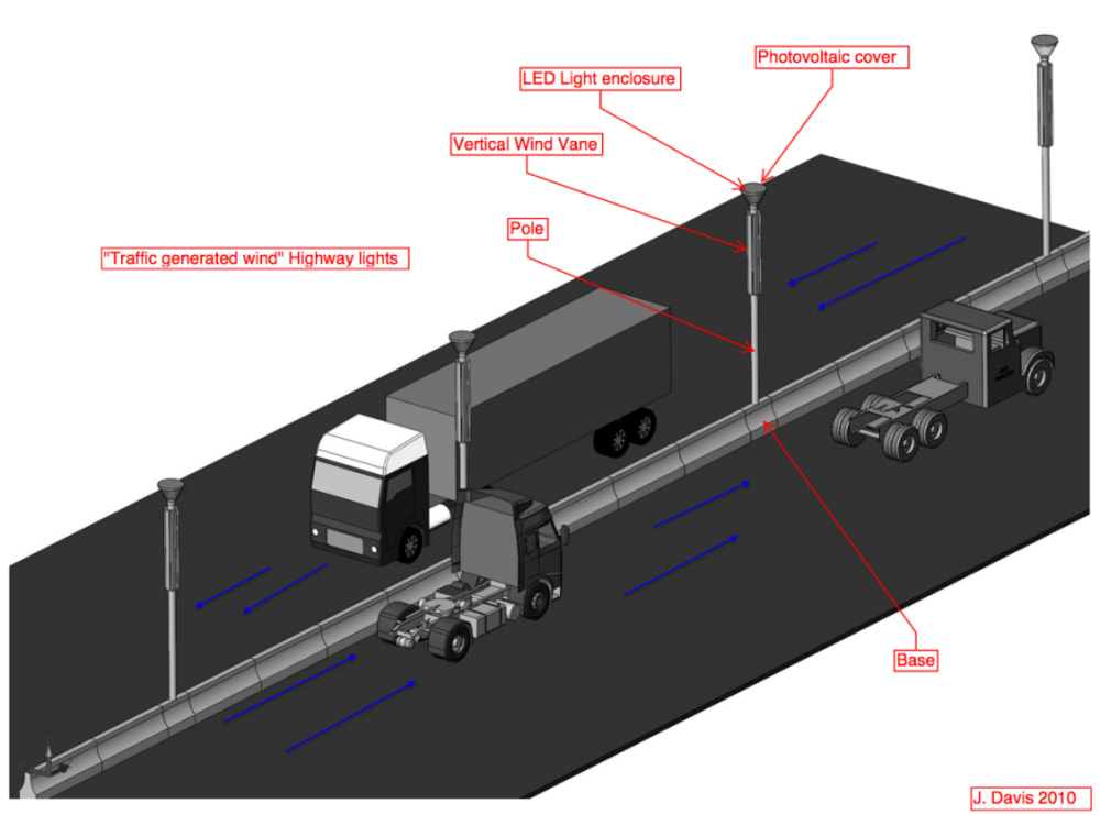 Conceptually the idea is to capture the opposing air flow and pressure that is developed from opposing traffic. These units stand alone with the "base" being a cement casting with no electro/mechanical parts. The Pole Assembly simply drops into and locks axially. This Pole assembly contains all the parts necessary. Maintenance i.e. bulb, battery, and power generation replacement, can be performed at the yard on spare units. Replacement unit is transported to site and swapped out in matter of minutes.