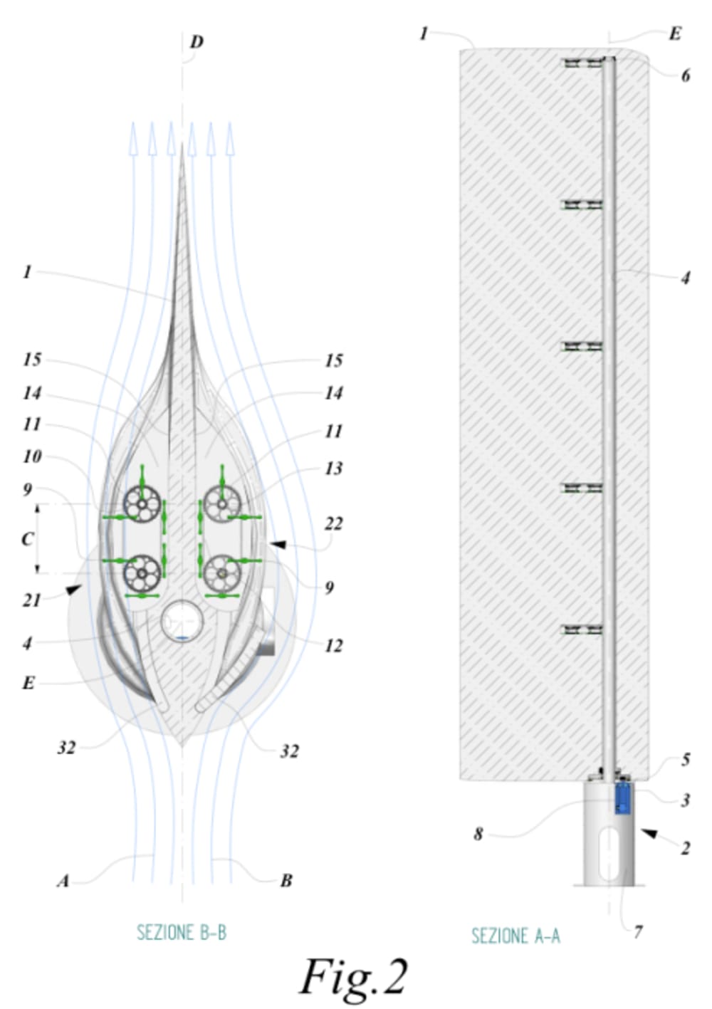 Fig. 1 (right) shows that it has a low frontal impact as compared to current types of wind power plant.
