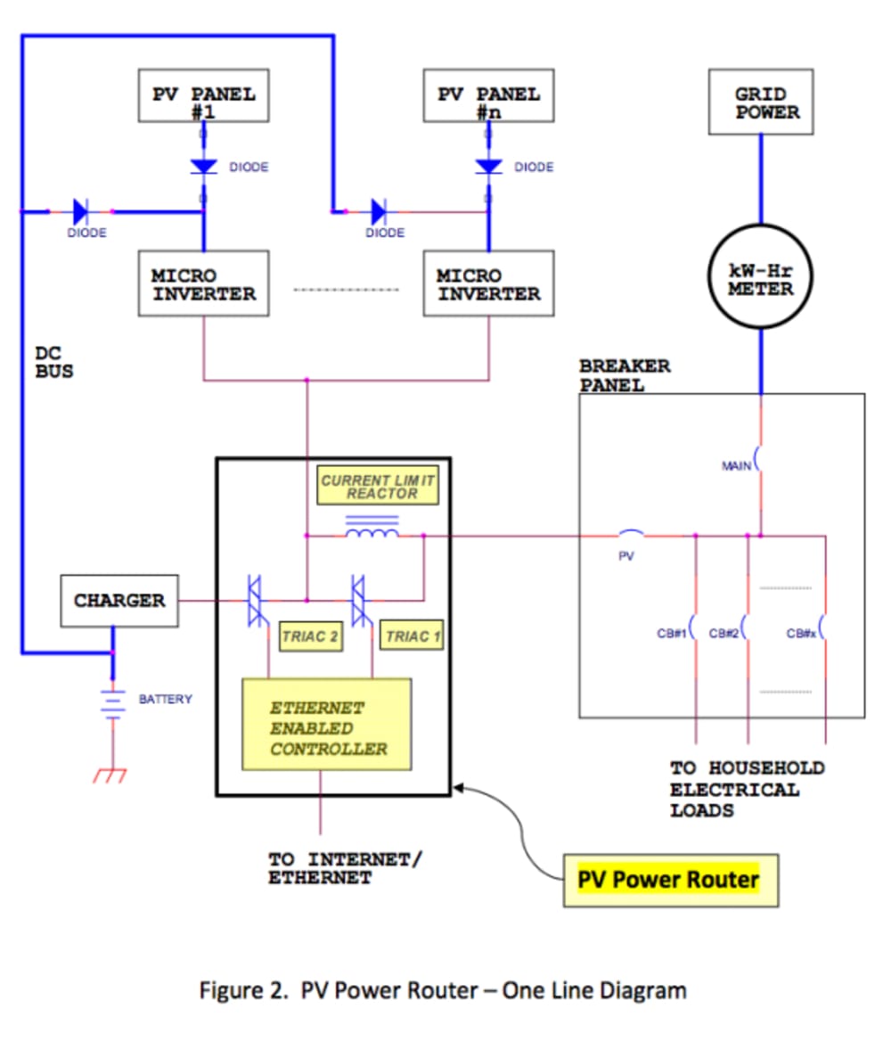 The PV Power Router makes full use of the micro-inverter technology, the most advanced solar powered inverter to date. Together they provide the best in safety, reliability, efficiency, cost, size, weight, and simplicity of use. As shown in Figure 2, a small ‘Current Limit Reactor’ allows the micro inverters to draw enough power from the grid to stay synchronized on grid power. The ‘Ethernet-Enabled Controller’ senses the magnitude and direction of current flow through the reactor to determine how much power demand to pass through ‘Triac 1’ to power the electrical loads in the home. When the power demand drops below the level the micro inverters and PV panels are producing, ‘Triac 2’ is turned on to operate the charger to store surplus power in the battery bank. Note that the triac is a solid state switch used to turn ac power on and off. The Ethernet-enabled controller can be implemented as an embedded micro computer, or a dedicated digital processor such as a Field Programmable Gate Array (FPGA) with I/O capabilities to sense, control and acquire data. Codes can be developed to use the future protocol for the national smart grid and smart appliances.