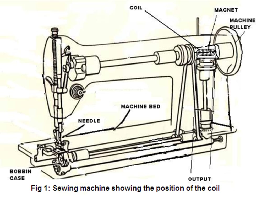 As seen from the specification,a motor of 500-700W is used to run the sewing machine.Assuming same amount of power is used by human also.With conversion efficiency of 90% ,we have 450-630W required by the machine.Lets say we are able to tap around 0.2% of this power,we have 900-1260mW.This amount of energy is sufficient for charging a mobile phone.