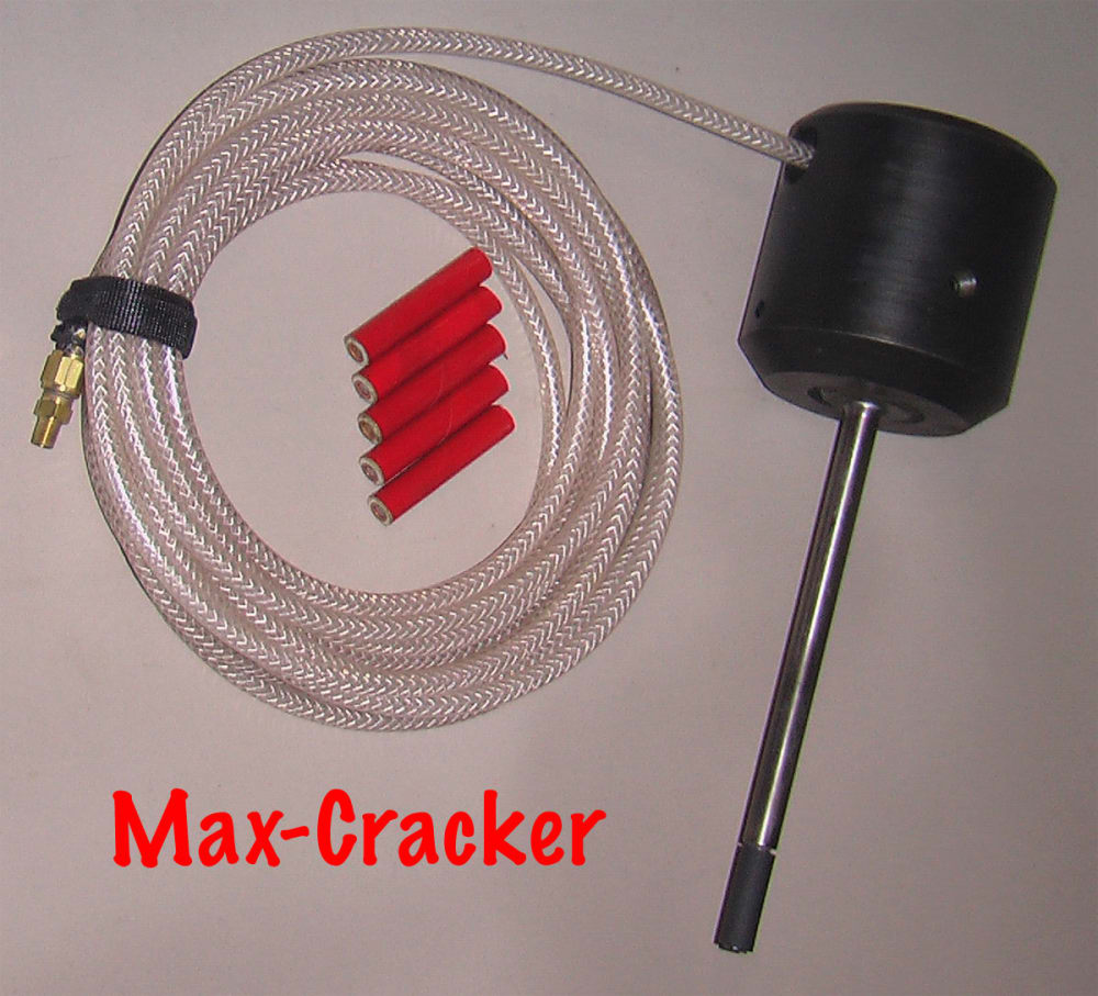 To use the system the operator first drills a 1/2" (13mm) diameter hole 12" to 18" (300-450mm) deep in the rock or concrete, cleans the hole of drillings, and inserts a cartridge(s) primer side up. This is followed by the introduction of the Max-Cracker head's firing pin tube into the hole containing the cartridge(s) . The user then retires to a safe distance, (min. 50 ft or 15M) after placing a suitable mat over the material to guard against any fly rock. Mats do not have to be heavy, old carpet serves this function well since the propellant used in the cartridges exhibits a pressure dependent burn rate and a very low propagation rate. A carpet mat also significantly attenuates the report to allow use in areas that restrict loud noise often to an audible "thump".