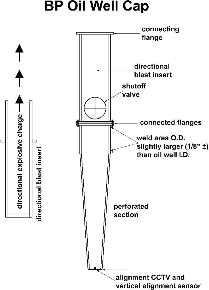 After Suddam Hussein blew up the oil wells in Kuwait during the Gulf War, the Department of Energy, British Petroleum and the Red Adair company were given three inventions for putting out the oil well fires faster in Kuwait. Red Adair used the water ring invention to extinguish some of the oil well fires in Kuwait. Nova did a documentary “Putting out the oil fires in Kuwait” which shows the water ring invention putting out an oil well fire with water for the first time. One of the other inventions, which was never used in Kuwait, plugs the oil well and allows it to be easily used again. A crude picture of the oil well plug is shown to the left. The delivery - support - positioning structure is not shown. A submersible delivers the oil well plug assembly over the oil well. The oil well plug is vertically centered and then the directional explosive charge is detonated forcing the oil well plug into the oil well. The oil well plug’s directional blast inset is pushed out of the oil well plug's top end from the oil pressure. The oil well plug is then welded to the top of the oil well and the valve is closed. The oil well can then be put back into operation.