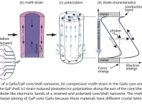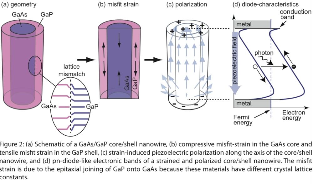 Figure 3 shows the operation principle of the invention. GaAs/GaP core/shell nanowires can be created using dedicated vapor phase epitaxy (VPE) despite the different lattice constants of GaAs and GaP crystals. It follows, however, that both the GaAs core and the GaP shell acquire a strain in order to enable the creation of this structure. This strain induces a piezoelectric polarization along the nanowires as a result of the material and crystal properties. This, in turn, gives rise to a built-in field in the nanowires and pn-diode-like device characteristics without a doping of the materials.