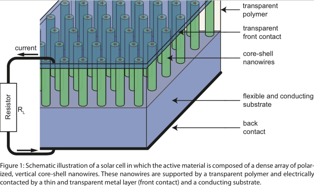 Figure 1 depicts a piezoelectric nanowire-based solar cell. The array of vertical core/shell nanowires replaces the commonly employed pn-diode of a planar solar cell. The built-in field of a typical pn-diode solar cell is hence replaced by a piezoelectric field, generated by the nanowires. Future developments of the invention are expected to make use of soft polymer-based substrates which would enable elastic and flexible devices.