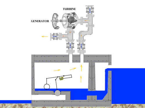 This concept is for local electrical power generation, easily scaleable to nearly any size or demand. The illustration shows one "bank" which would be suitable for a small village or neighborhood. Adding additional "banks" would make this suitable for whatever size demand.