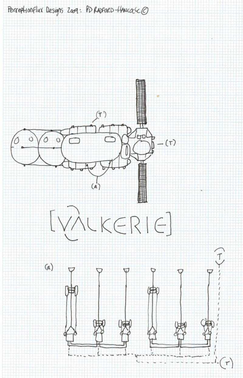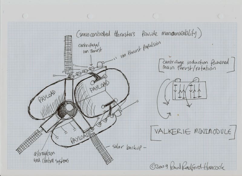 Valkerie is an attempt to create a multi-platform, multi-mission reusable spacecraft that uses gravimetric conditions in space to provide long-range capabilities. It is unique in that its main power source is a series of sequenced mechanical generators which use gravity as a force input and makes the craft in effect self propelling.