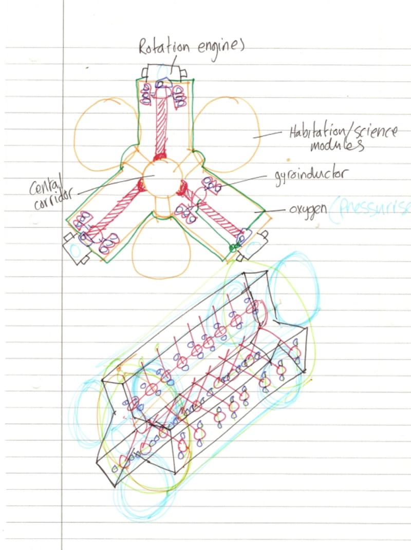 The craft has some basic requirements that must be met in its design in order to be functional. The conceptual design which we are working from today is that there are equidistant rows of gravity generators arranged around the axis of symmetry, with a control and solar backup module to the rear of these, through which some of the generated electrical power is used for the ION engines which are the main forward motion causes. Power must also be assigned to the banks of rotational thrusters that are situated at an angle of ninety degrees on top of each bank of gravity generators, and it is necessary to have some small thrusters fuelled by conventional propellant for starting/restarting the array, which relies of centrifugal/centrepial inertia forces from long axis rotation.