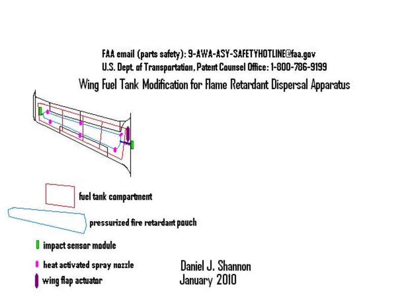 The pouches contain dry powder AFFF-UL flame retardant and a chemical propellant to initiate a rapid chain reactive gas (CO2) expansion, activating dispersal of the chemical through flap actuator-triggered automated nozzles on the pouches in the event of a measured crash impact. Each pouch is wired to two battery-powered electronic impact sensors, one sensor at the base of the wing, the other at the wingtip. The central tank would have impact sensors on its front and rear bases, and on the underside surface. When the impact sensors, through G-force measurement, detect a crash impact has occurred, electrodes in the sensors send electric current to the nozzles, opening them and dispersing the flame retardant. As the retardant powder makes contact with the heated air / flames produced by the ignited fuel, the retardant powder releases gases (CO2 ?) which act as an oxygen barrier to the fire, and it self-extinguishes relatively rapidly enough to prevent potential more severe burn injuries to passengers and flight crew. Toxic smoke fumes are also diluted (and diminished?) in this process, and lung injury potential is lessened.
