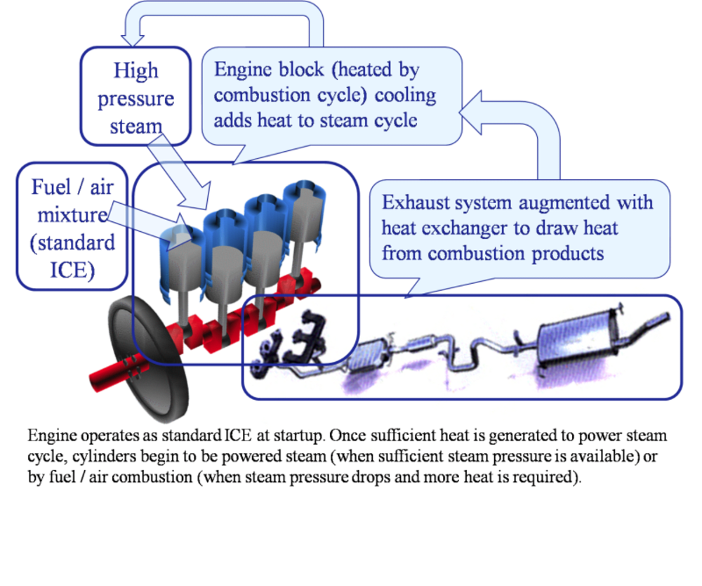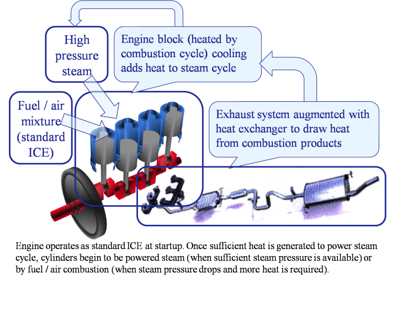 It seems as though there is an incredible amount of wasted energy in current internal combustion engine designs, especially in terms of the amount of thermal energy that in one way or another is just vented to the atmosphere. Significant amounts of thermal energy are wasted through the vehicle's radiator, while still more is lost through the exhaust system and exhaust products. My idea is to combine a conventional internal combustion engine with a steam engine where the steam is generated by the heat of the combustion cycle. In its simplest form, one could take a standard four cylinder engine and power two of the cylinders by combustion and two by steam generated by cooling of the engine and by extracting all possible heat out of the combustion process once the products leave the cylinder. One potential drawback for this design is that the engine would operate at startup only under the power of two cylinders until sufficient heat is built up to power the steam cycle. A more complicated design may have cylinders that are powered by either by combustion or steam, just a matter of valving and mimimum steam pressure. In this manner, the engine could transition at startup from full combustion to mixed / hybrid operation, having the combustion process fire only when additional pressure is required. It's just a guess, but it would seem as though this modification would double (or more) the current fuel economy of standard internal combustion engines.