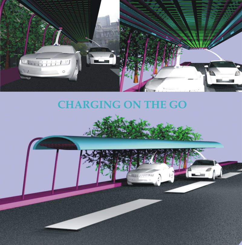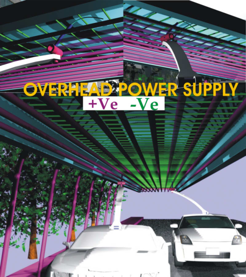 The designing is such that the car need not be stopped while being charged and can even turn at angles. Cars can even be parked beneath the grid with their charging arms raised thereby continuously absorbing power and getting charged.