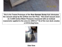During the development of this design it was found that a small vacuum existed on the rear end of the vehicle. The rear deck area multiplied by the negative pressure resulted in a 4-5 lb force pulling backwards. By eliminating it completely with the Rear Air Scoop (see Feature A photo) a gain of 4 to 5 MPG was realized. This rear force being pulled at 65 MPH consumes approximately 0.8 HP. This Feature was designed using a personal 3D ACAD system and the detailed parts were produced on a local steel laser cutter, assembled on-site, and painted.