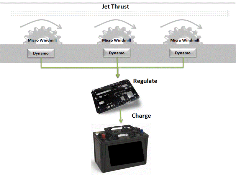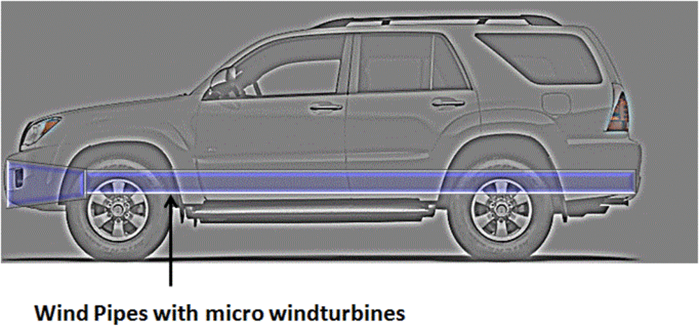 By careful design, one could think of implanting mini turbines that can produce electricity while the jet of air passes over them. This energy will be fed into the battery for further use by the vehicle system as described below.