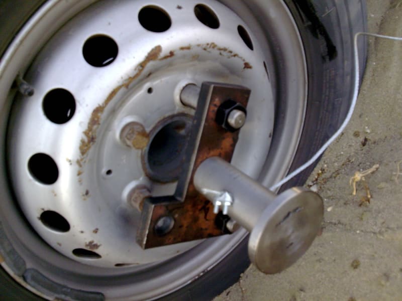 Take out 2 screws of the wheel which is giving the movement, Install the device with the 2 ,8 cm long screws. Tie the steel-rope to a tree, rock, or anywhere in which it can take pressure. If none of these are available then nail down one metal stick and tie the rope on that. The same procedure will be done to the other wheel as well. Start the car. The wheel will start to spin but the car will not move until the steel-rope is tense (the spinning of the wheel will make the steel-rope to wrap onto the mechanism, locking the wheel like it's touching on firm ground. The same will happen to the other wheel until both steel-ropes are tense.