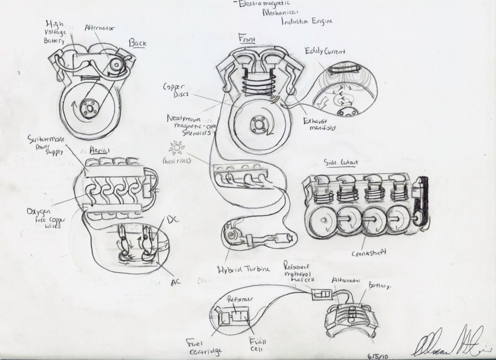 The Electromagnetic Mechanical Induction Engine is the crossover between an electric vehicle, and a hybrid engine. Derived from the operation of a linear induction motor roller coaster, this electromechanical engine changes linear induction, to rotational induction. The linear motion of electromagnetic propulsion seen on many standing- launch roller coasters can be used to propel vehicles, as a proper alternative to the gasoline combustion engines. With this electromechanical engine, the rotational motion of induced magnetic fields generates a mechanical force when applied to a load. An EM.M.I.E. consists of two switch-mode power supplies having a total output power of five hundred kilowatts. Both supplies having alternating and direct circuitry provide a total current of five hundred amperes, to four neodymium magnetic-core solenoids, inducing a high magnetic field. The induced fields are conducted by eddy currents within four brake rotor-like copper discs, rotating on a crankshaft. the output rotational speed of the shaft is then connected to a flywheel, applying the rotational force to a transmission, thus providing motion when in gear. during this process, there is no fuel consumed because of a pulley placed on the other end of the crankshaft, turns a belt connected to an alternator to recharge a high voltage battery. The battery will then provide the current distribution within both supplies upon rotation of the shaft by electronic gear measuring. To start the engine, a small reformed methanol reformed fuel cell will charge the supplies to begin the rotation cycle, causing the battery to take place of recharging the engine within computer based idle rotation. the fuel needed for the fuel cell can be produced from petroleum, which involves diluting petroleum's natural flammability and toxicity. The engines by-product of producing electromagnetic radiation is shielded by laminated metal sheets placed within the block of the engines structure to limit environmental exposure. Upon acceleration of the engine, computer measurements of throttle positioning will trigger an increase for power within the ECU, causing a greater field induced on the discs, therefore increasing speeds. The overall weight and size of the engine being substantially less than an internal combustion engine, causes the high conductivity between the copper discs and solenoids to create greater acceleration, and average speed of most automobiles. The engine having no emissions and high mileage under operation; many combustion engines, require refueling and burning of harmful chemicals such as benzene, carbon monoxide, sulfur, and nitrogen oxide, the leading contributors to air pollution among vehicles today. Within this engine the benefits are abundant, in which it dramatically reduces global consumption of petroleum. and does not consume nor combust fuel for motion. with less parts such as having no pistons, cam gears, valve springs, spark plugs and etc., makes manufacturing less expensive than combustion engines. The construction of this type of engine can be in either front, rear, or all wheel drive vehicle capabilities. This engine can also provide a thriving new industry for motor vehicle technology, and push closer to alternative energy solutions.