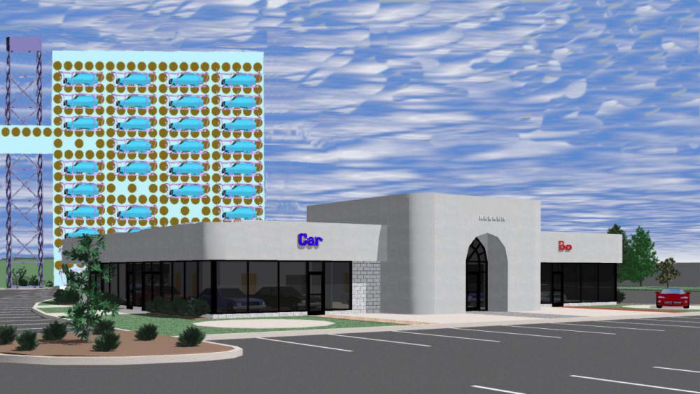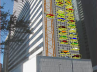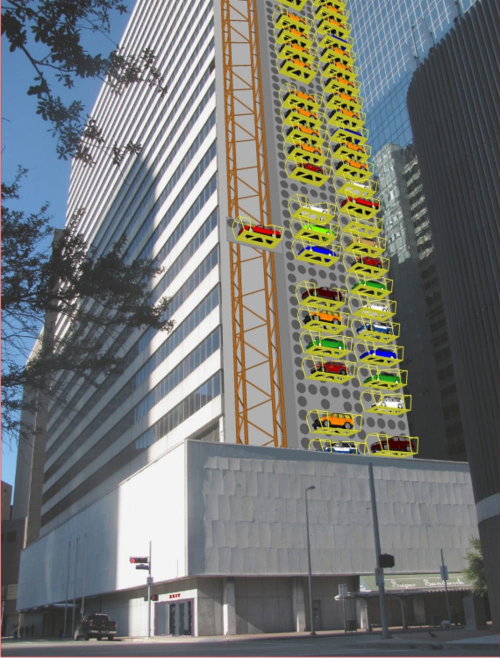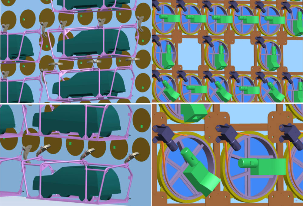 - system is suitable to be retrofitted into environment of densely populated city, for example: public parking alongside high-rise building; car dealership inventory parking can use less space and have vehicles exposed for observation, but securely stored; sport venues may use rows of wall parking systems and save acres of space around them, at the same time organizing flow of vehicles in and out.