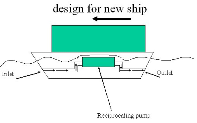 Old & current ship designs have the propeller to run the ship. Here I have designed a ship with a small replacement. It gives high efficiency, which is a theoretical calculation. In this ship from an imaginary line on front and back shows that it won't submerge in water whole from any unwanted ocean waves. Short turning can be taken in this ship. Instead of a propeller here a reciprocating pump is used.