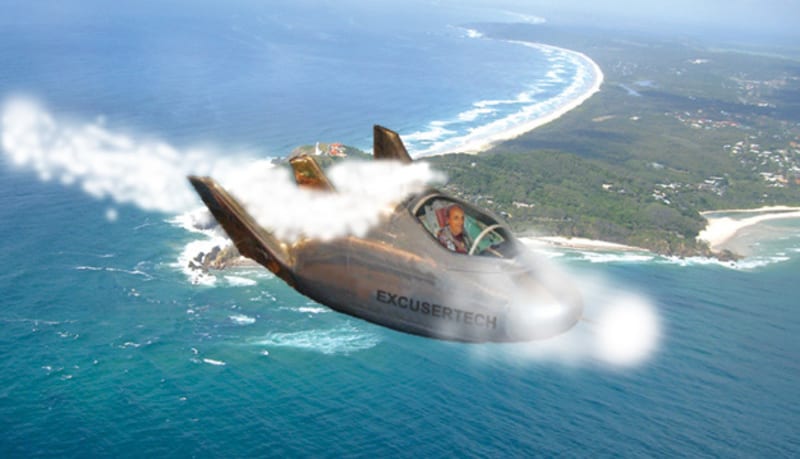 But allow me to dream of an aircraft with oxy-hydrogen fueled frontal drag reduction, and rear propulsion. A flame-front of burning oxy-hydrogen moves at hypersonic speed, so there is potential for very fast transportation. To complete the picture we could add an Excuser on the upper surface of the aircraft to increase lift. Taking that to the maximum and we could hover too!