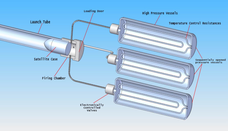 A common steel structure can be built to support the barrel along two parallel circular rail tracks for positioning purposes. A small scale prototype is relatively cheap to produce and a full scale system would be far cheaper to build and operate than rocket based ones.