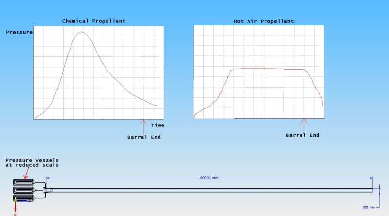 Since the maximum working pressures can be significantly lowered, it should be possible to use a much cheaper and lighter barrel to reach the same exit velocities. It will only take a longer barrel to reach higher velocities.