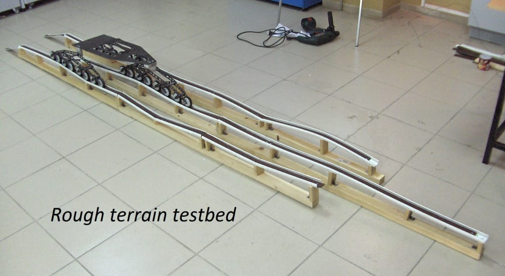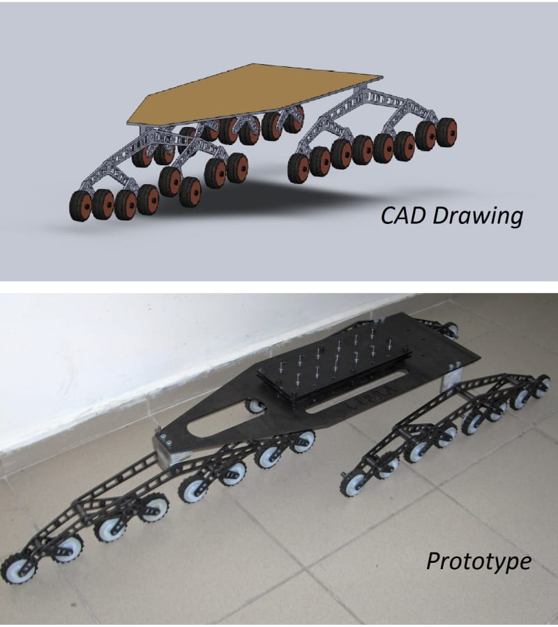 I modeled and then created a prototype of a rover with three bogie groups in which eight wheels are used (next figure). To simulate rough terrain, I tested the rover on a wavy road test bed (see last figure). At the end of the tests, I saw that the top plate showed no significant tilt even when moving on a really wavy ground! This solution shows that this mechanism has a potential to be used not only in Mars rovers but also in any off-road vehicles.