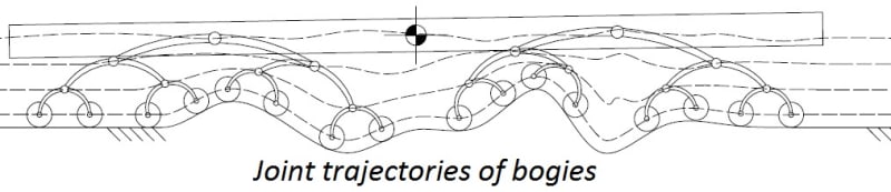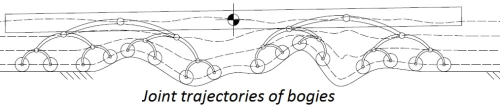 Most of the modern rover designs use rocker-bogie suspension. Unlike this anti-symmetrical rover design, I designed a rover with completely symmetrical three-stage bogie mechanism. Preliminary results of CAD studies have been shown that using of a multi-stage bogie mechanism results in a more stable rover (See sketch in the first figure).Eight wheels are connected to vehicle via three stage bogie-suspension. Bogies rotate under the gravitational force and all wheels in touch with ground surface. This makes wheel center trajectories to be very similar to ground profile. But middle joint of the first stage bogie link is at an average point of the joints at two end points, middle joint of the second stage bogie link is at an average point of the joints at two end points and so on. It means that, every bogie link functions as an averaging device. Disturbances on ground are absorbed by bogies step by step at every stage. Finally, trajectory of vehicle’s main body converges to a linear path. This simple principle causes the absorption of the road roughness.
