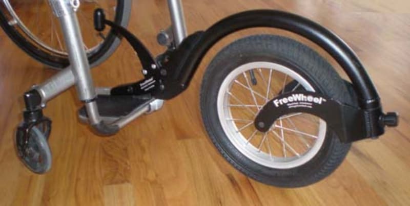 The FreeWheel is a durable, light weight (5 lbs.) aluminum third-wheel that quickly and easily clamps to the footrest of a rigid-frame manual wheelchair. It instantly turns a wheelchair into an all-terrain chair. By lifting up the front casters the FreeWheel easily navigates rough terrain, from uneven sidewalks and curbs to grass, dirt trails and snow covered areas.