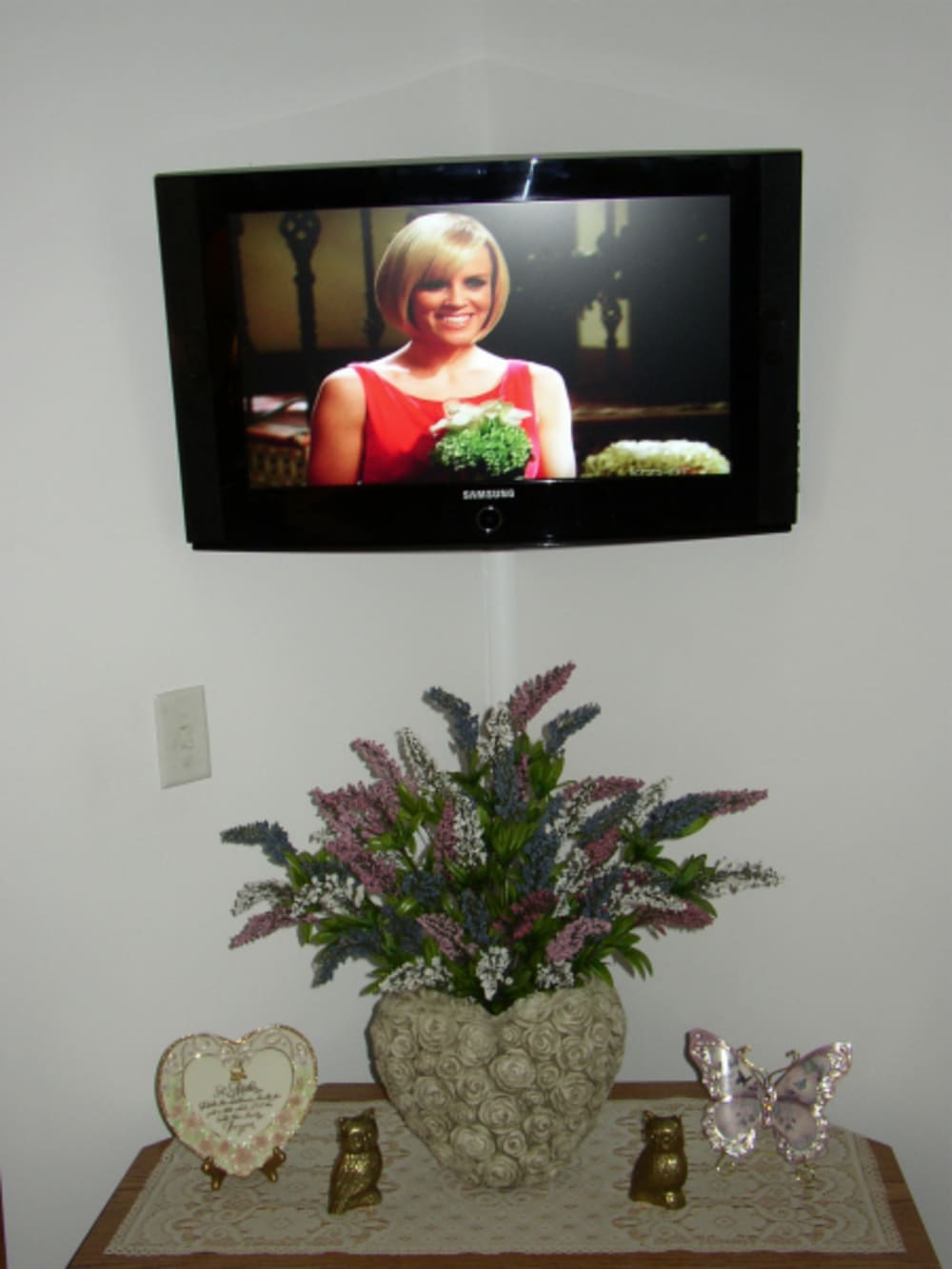 Saves valuable wall space by allowing user to hang flat screen televisions and pc monitors in the corner of any room. The bracket remains completely hidden behind the tv screen/ monitor. U.S. Patent #7,883,066. This system has only 3 parts, and is much easrier and less time consuming to asemble than any other bracket on the market today. overall weight is around 5 lbs. the 3 piece design allows for articulation to the left and right, as well as adjustment in/out away from the corner to accommodate a variety of screen sizes. A lock may be applied to the bracket, which adds security from theft.