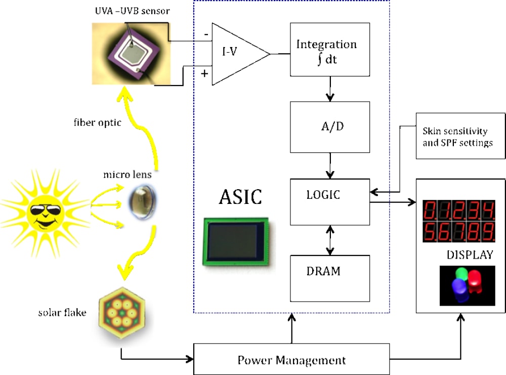 Current products and technology are based on estimated time exposures. None of them use actual UVA and UVB dose detection. Non-clinical devices use either a PMMA thin film or metal dyes, which exhibit reversible chemical reactions when exposed to UV radiation. These devices are not user friendly, cannot be integrated into small inexpensive user-friendly products, and the actual dose is hard to determine.