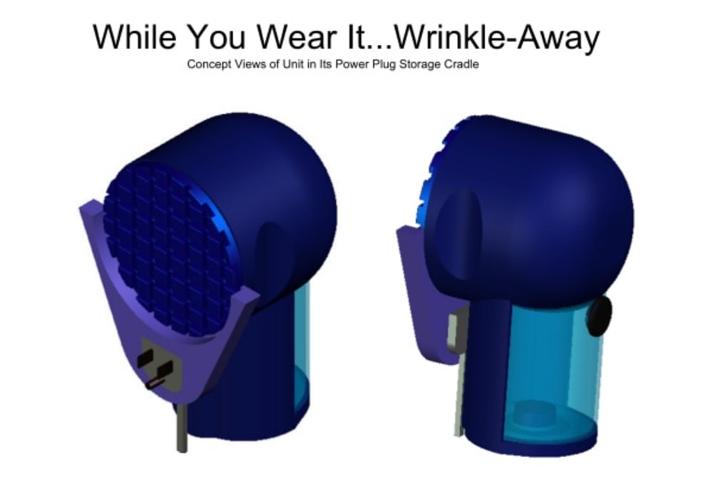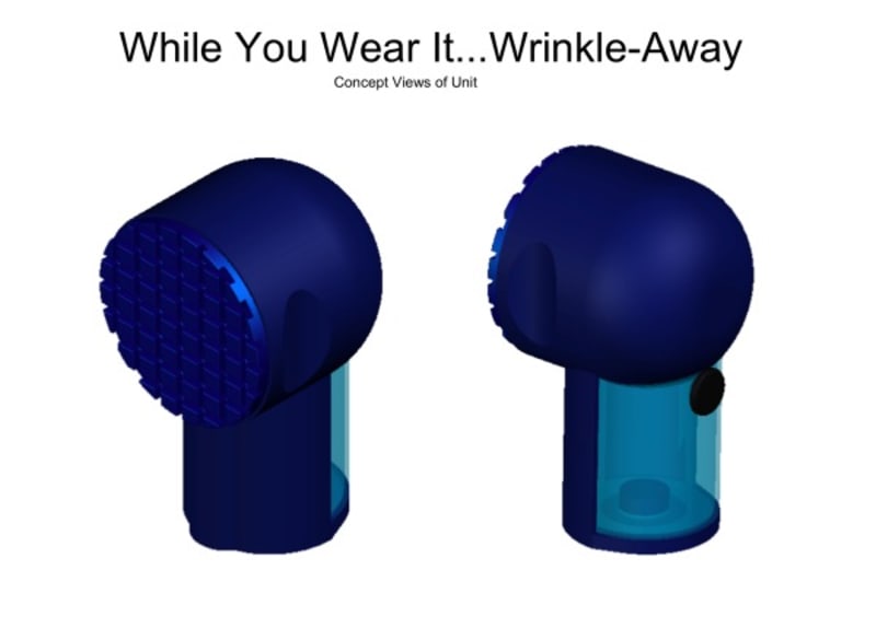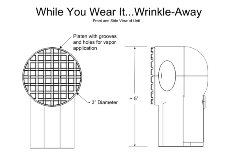 The “While You Wear It…Wrinkle-Away”© is a small hand held device that allows you to remove wrinkles from clothing while you are wearing them. Fabrics that wrinkle easily mainly do so because moisture lowers their glass transition temperature, which is where the molecules loosen allowing for re-arrangement of the fabric’s fibers. Textiles such as cotton and cotton blends are among the most problematic. But, if they can wrinkle easily we should be able to remove the wrinkles almost as easily! This becomes obvious when you see such products as wrinkle releasers work. They may not be perfect, but essentially do relax wrinkles by simply wetting the fabric and using your hands to stretch the material. The downside is that you end up with wet spots all over your clothes, which can wrinkle again if you don’t keep the wet spots relatively flat before they dry.