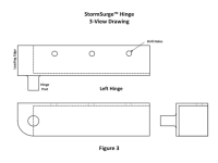 Installation (Figure 2): Comprised of an affordable, easy to install hinge and beam system, StormSurge™ can be incorporated into most conventional dock designs and can be completed as a Do-It-Yourself project. StormSurge™ hinges (Figure 3) are self-locating and are attached with screws to both ends of each decking board. Manufactured in several standard sizes, they can be used with many popular construction materials including pressure-treated lumber, composite, PVC, and plastic decking. A specially designed beam is attached to the outer joist by means of a predrilled hole pattern that ensures parallel alignment and proper spacing for the decking boards. The decking boards are then installed by inserting the StormSurge™ hinge posts into the pivot holes of the beam along one side of the deck with the pivot end (or leading edge of the deck board) positioned to face incoming waves. Next, the decking boards are locked into the correct orientation by inserting the free hinge post ends into the pivot holes of a second beam which is attached to the opposite outer joist. Once both beams are attached to the deck's outer support structures, the installation is complete!