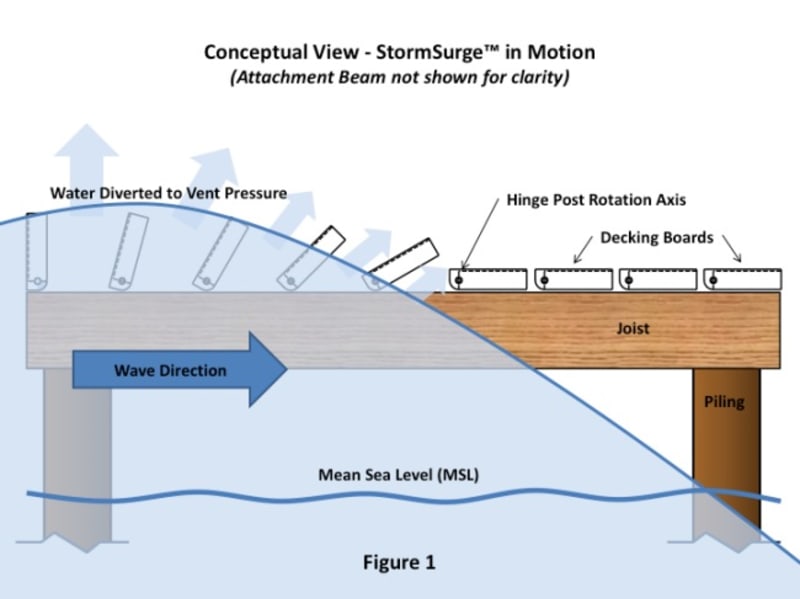 Solution: The StormSurge™ Decking system provides a much-needed solution to dramatically increase storm resistance through a simple pressure relief concept that allows normal decking boards to function as a system of dynamic louvers when over-pressurized from beneath (Figure 1). This allows for the traditional look of stationary piling construction that you can’t get with floating docks and gridded deck designs.