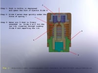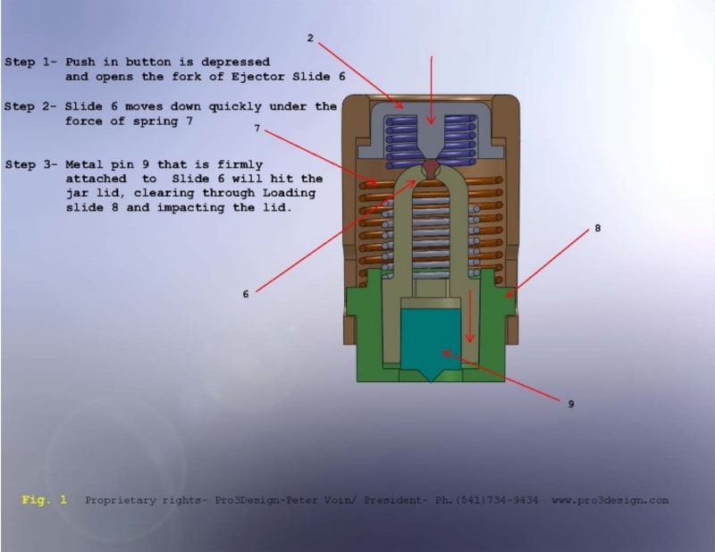 -By pressing the Button (2), the fork of the Ejector slide (6) is released from the Locking pin (4) and because of the tension from The spring (7), will move down all the way together with the Contact impact pin (9)that will impact and dent or pierce the lid, canceling the vacuum effect.
