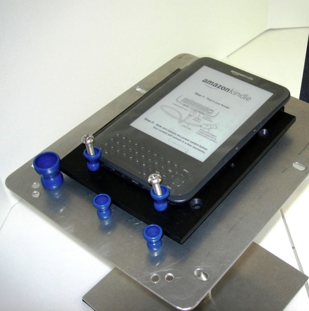 I designed an iPad-sized plastic insert adapter to fit on the top plate. It attaches to the top plate similar to inserting an ipad. It also functions in the same manner as the ipad top plate. This plate however is designed for the 7” displays—the Kindle as well as other tablets. In addition, this insert plate can have its own stand.